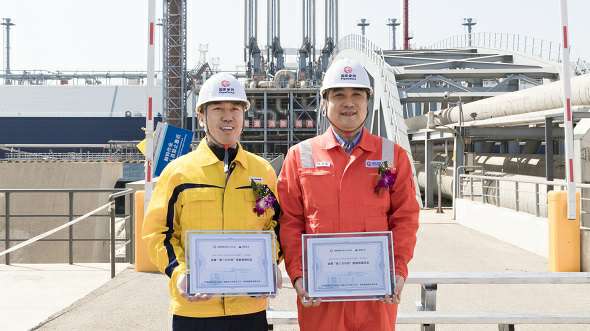 九游网页版·官方端网站-九游(中国)和国家管网天津接收站共同举行了九游网页版·官方端网站-九游(中国)首船LNG接卸和首车发车仪式。国家管网天津接收站总经理张林松和九游网页版·官方端网站-九游(中国)智能贸易及输配业务群副总经理尹明分别代表双方互换纪念铭牌。